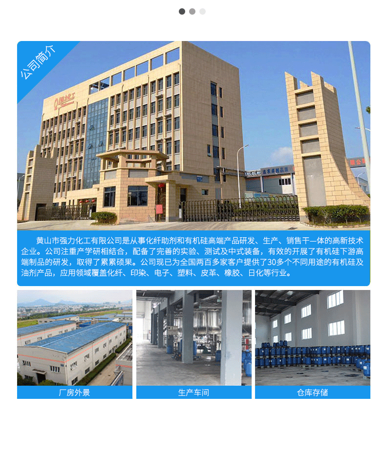 集研发,创新,生产,销售相结合,重点以生产研发有机硅新材料:以二甲基硅油、乙烯基硅油为主,以羟基硅油、有机硅乳液,氨基硅油,纺织助剂为辅的多元化化学工厂。