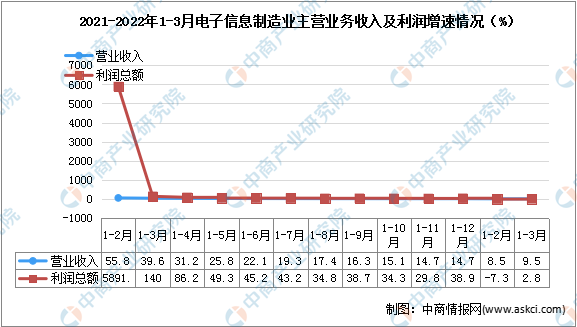 2022年一季度,规模以上电子信息制造业实现营业收入33791亿元,同比增长9.5%,增速比1—2月份高1个百分点,比同期工业营业收入增速低3.2个百分点;营业成本29546亿元,同比增长10.2%;实现利润总额1433亿元,同比增长2.8%,扭转1—2月份负增长态势,营业收入利润率为4.2%。