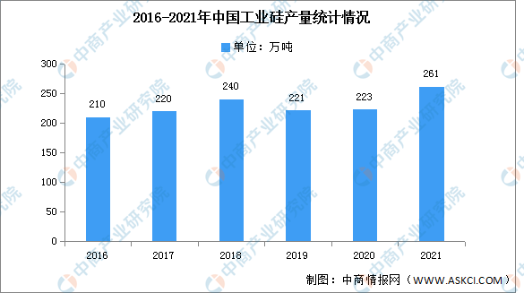 近年来,我国为达碳中和、碳达峰的目标,可再生能源化转型势在必行,从而也带动了工业硅市场。2021年,我国工业硅行业总体运行平稳,行业供需两旺,价格大幅上涨。2021年,中国工业硅产量261万吨,同比增长24.3%。