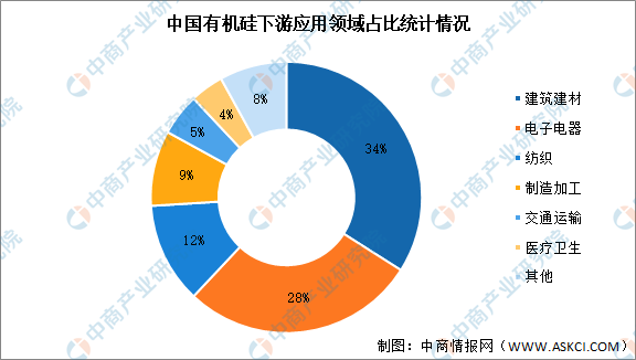 数据显示,我国有机硅行业下游应用领域中,建筑建材行业占比最大,达34%;其次为电子电器行业占比达28%,纺织、制造加工、交通运输、医疗卫生行业占比分别为12%、9%、5%、4%。