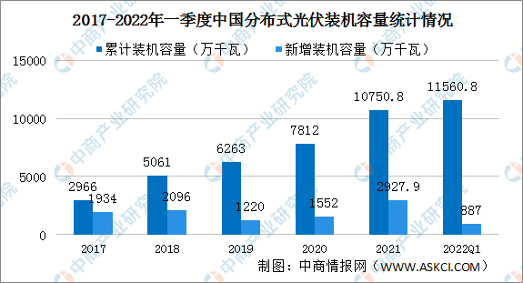2021年分布式光伏装机容量达到1.08亿千瓦,突破1亿千瓦,约占全部光伏发电并网装机容量的三分之一。分布式光伏新增约2927.9万千瓦,约占全部新增光伏发电装机的55%,历史上首次突破50%。2022年一季度分布式光伏装机容量1.16亿千瓦,占光伏总装机比重36.4%,与上季度相比提升1.2个百分点。新增装机容量887万千瓦,同比增长192%,新增分布式光伏占全国新增光伏装机总量的67.1%,同比提升12.5个百分点。