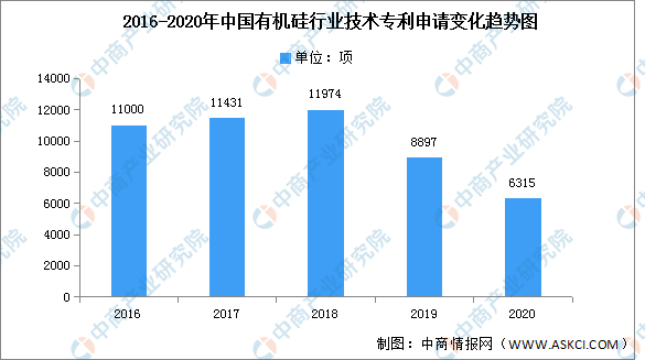 数据显示,2016-2018年我国有机硅行业技术专利申请数量稳定增加,2019年开始有所下降,2020年我国有机硅行业技术专利申请数量为6315项。