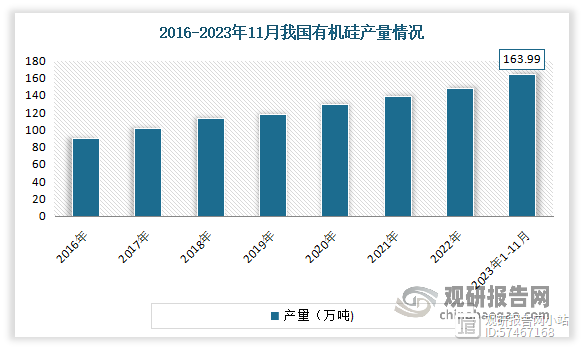 近年随着国民经济的发展和人民生活水平的不断提高,有机硅产品的应用领域不断扩大,特别是在世界能源危机日益加剧的背景下,作为非石油路线的化工新型材料,有机硅愈加显示出其强大的生命力和广阔的发展前景。目前我国是全球最大的有机硅生产国,2020 年我国有机硅产能及产量都占全球的 50%以上。数据显示,2023年1-11月我国有机硅产量为163.99万吨。