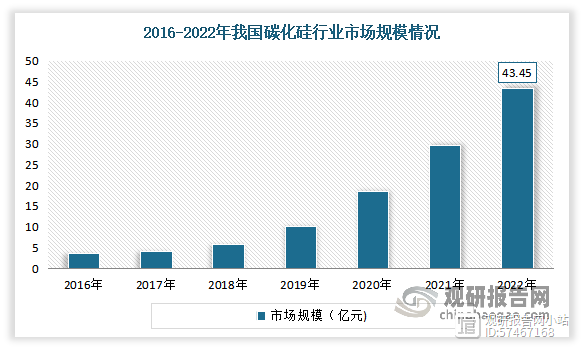 近年我国碳化硅行业现状呈现出快速发展的趋势。目前我国在碳化硅行业中具有较高的生产能力和技术水平,同时中国政府也积极推动碳化硅产业的发展,将其列为战略性新兴产业之一。数据显示,2022年我国碳化硅市场规模约为43.45亿元。